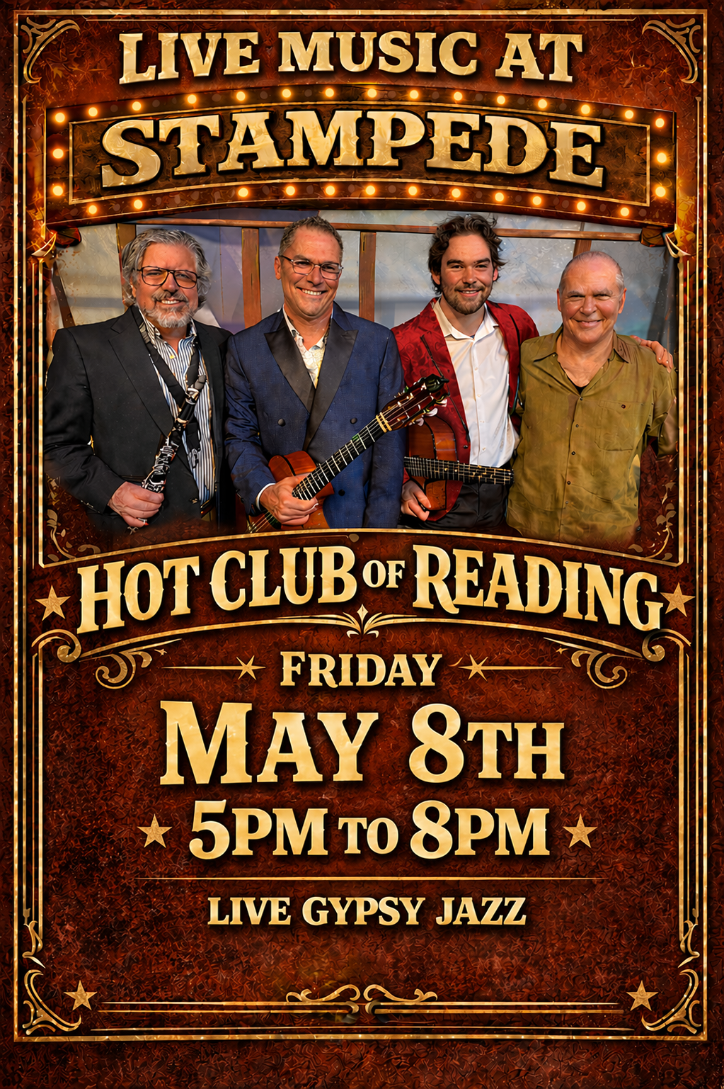 Live music is back at Stampede! Join us for an evening of gypsy jazz with the Hot Club of Reading — a four-piece quartet bringing classic Django Reinhardt-style swing, early New Orleans grooves, and upbeat acoustic energy to the dining room.